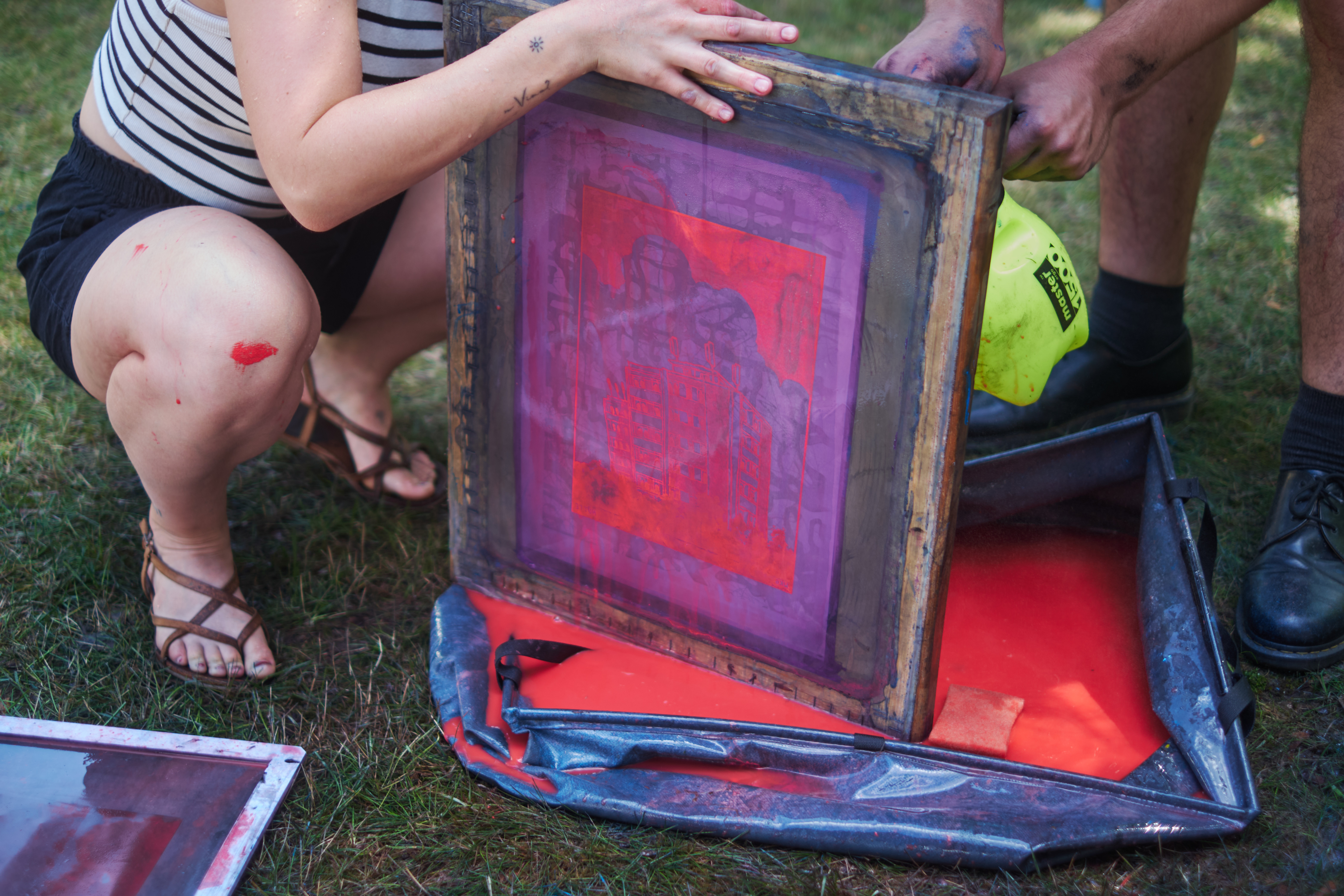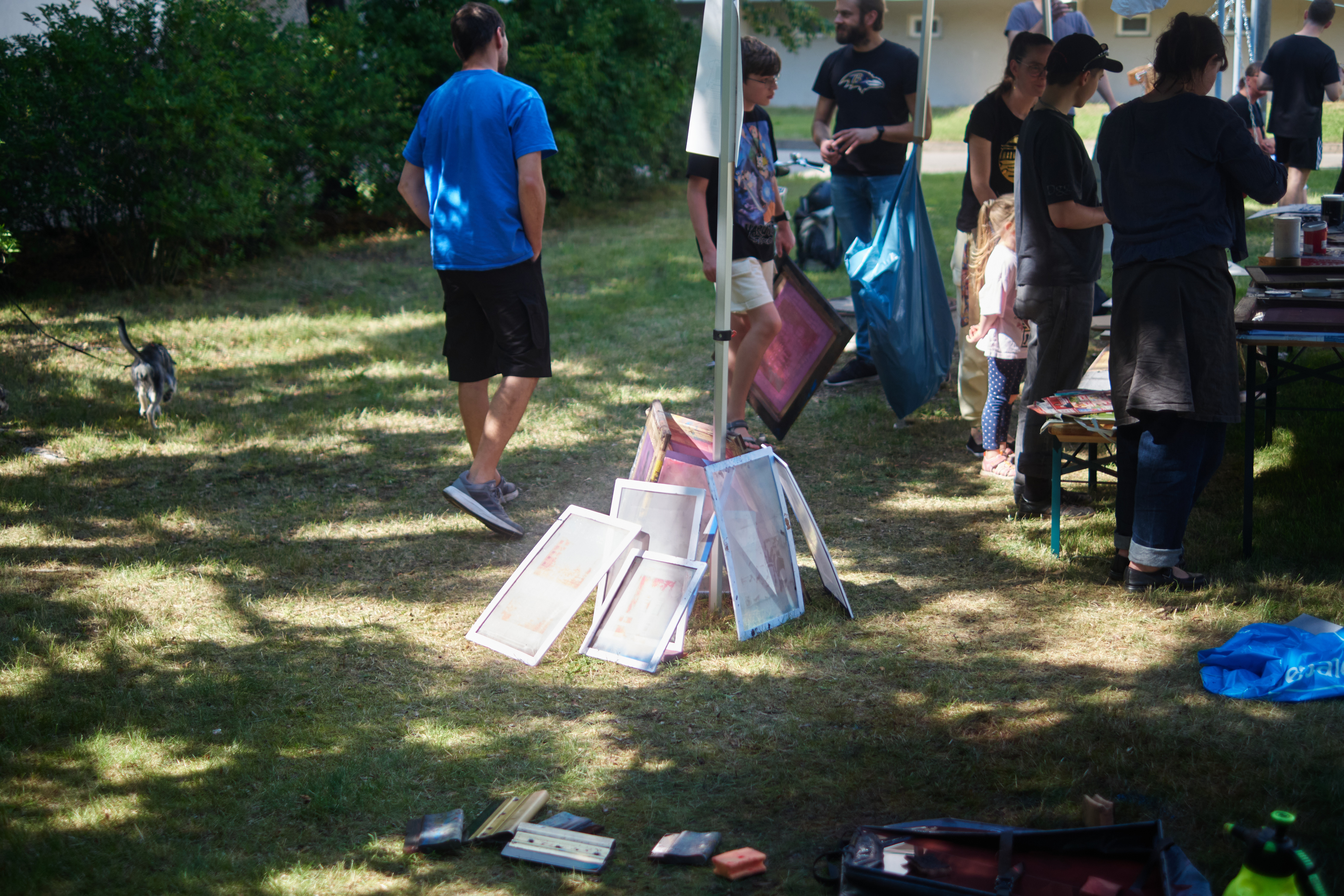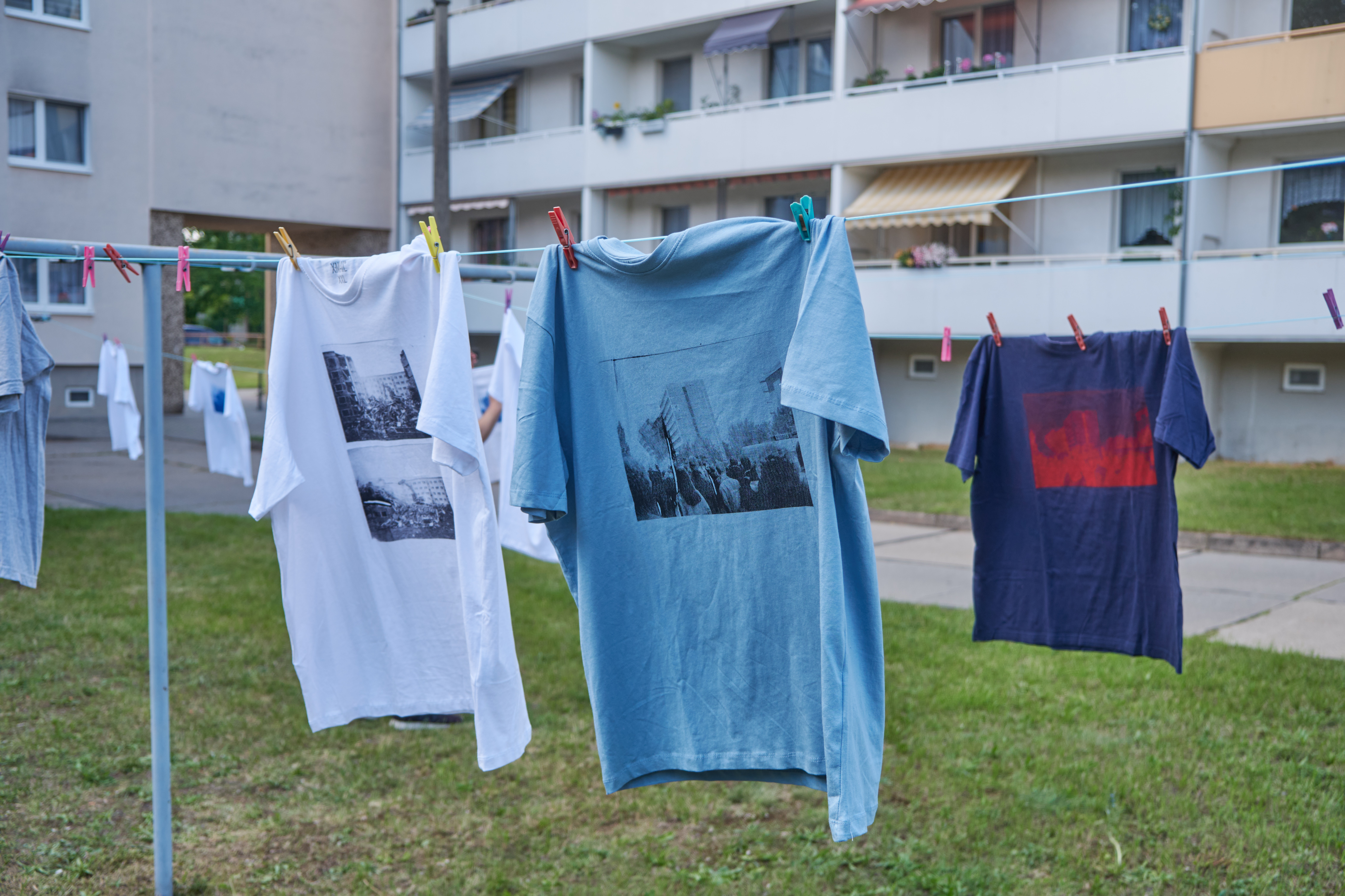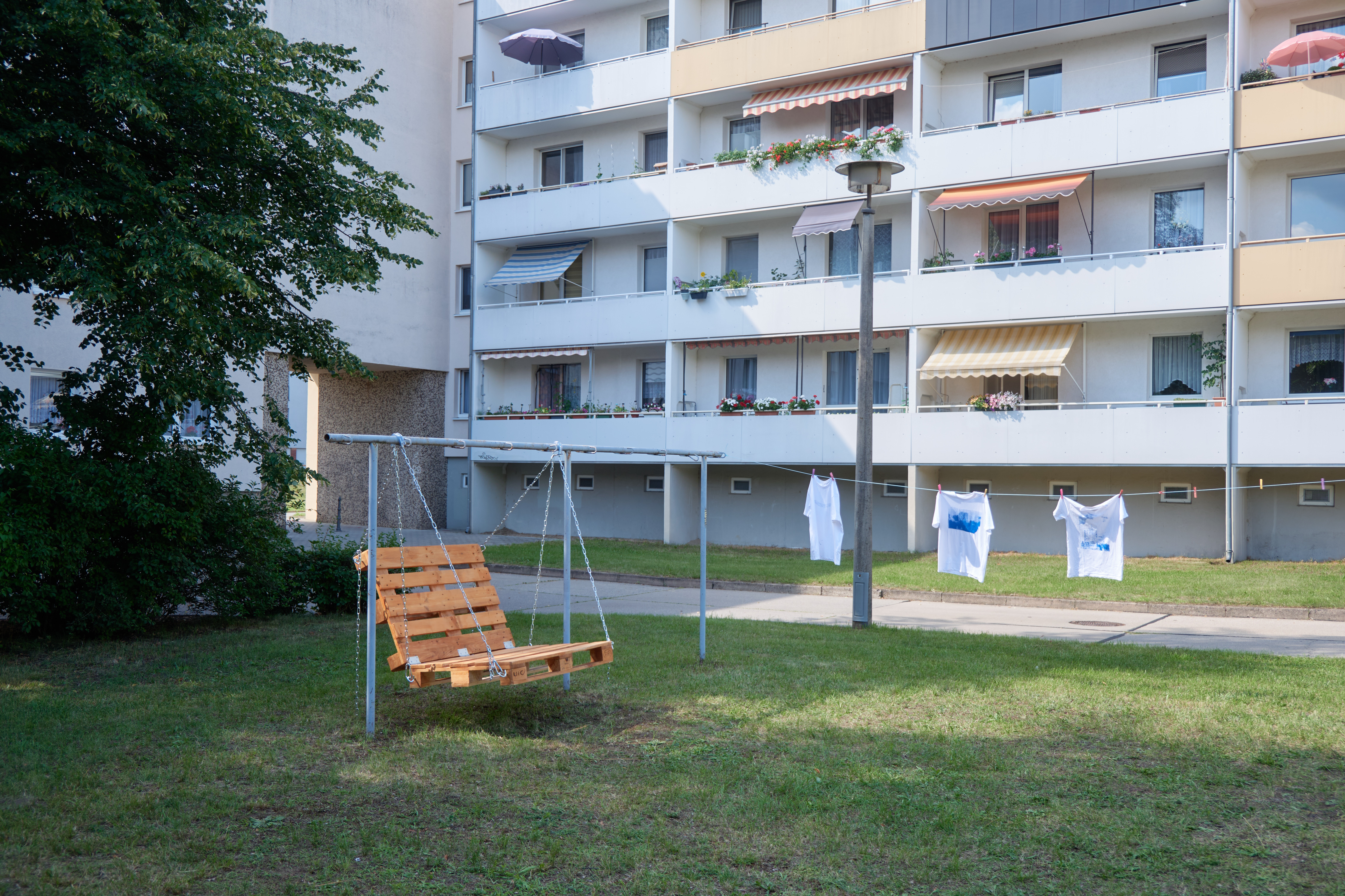 Der Wohnkomplex (WK) 6 ist der Teil Eisenhüttenstadts, der am meisten von der Infrastruktur und den Kulturangeboten des Zentrums abgeschnitten ist. Das war nicht immer so. Wir möchten neu über den WK6 erzählen, jene zu Wort kommen lassen, die schon immer hier gewohnt haben, aber auch den Eifer der jungen Hüttenstädter anstacheln. Wir griffen auf die Gestänge auf den ehemaligen Wäschetrockenplätzen zwischen den Wohnblocks zurück – nutzten sie für Hollywoodschaukeln, die wir mit jungen Leuten aus dem Viertel bauten, und als Ausstellungsfläche. An den Leinen hingen nun T-Shirts, Tischdecken und Laken, die wir frisch bedruckt hatten – gemeinsam mit den Bewohnerinnen des WK6, deren private Fotos die Motive lieferten. Nun hingen sie im Wind und erzählen ihre Geschichte des WK6.