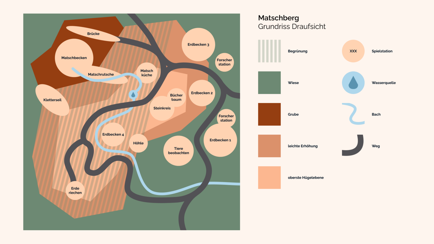 Der Matschberg hingegen lädt Groß und Klein ein, die Geheimnisse unseres Bodens mit allen Sinnen neu zu entdecken. Er ist wie ein großer Abenteuerspielplatz. Auf und um den in einem Park gelegenen Hügel herum befinden sich mehrere Stationen, die ein kreatives Eintauchen in die Erde ermöglichen: Erforschen, Spielen, Träumen und Beobachten. Jede von ihnen hat einen anderen Schwerpunkt wie Gesteinsarten (geologisch) oder Bodenlebewesen (biologisch) und bietet eigene Blickwinkel auf das Verborgene. Dazu gibt es auch anschauliche Erzähltafeln oder “pädagogische” Veranstaltungen, die die Geheimnisse der Erde durch die reine Freude am Dreckig-Werden zelebrieren.