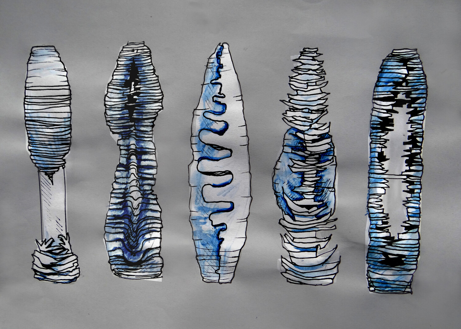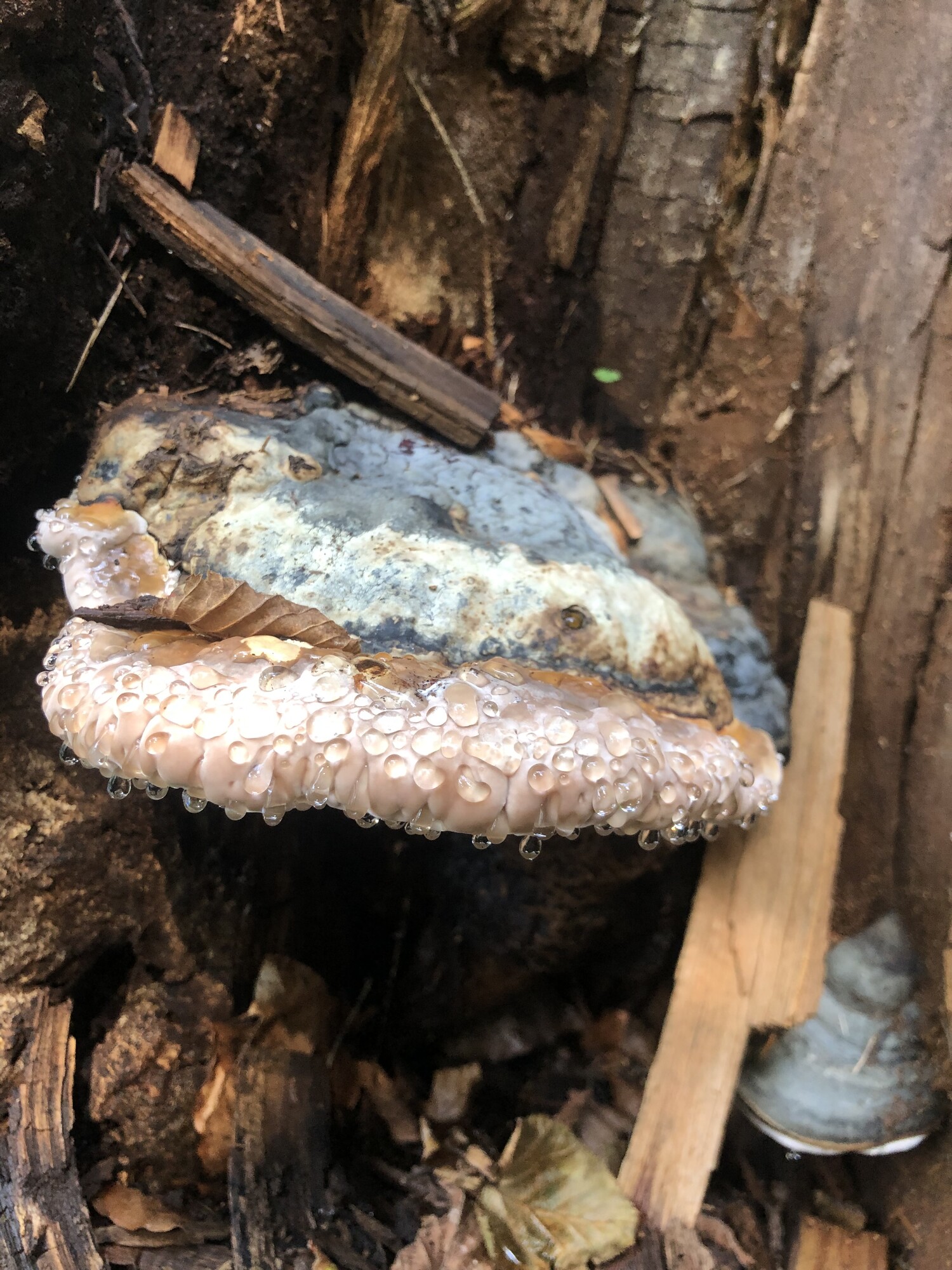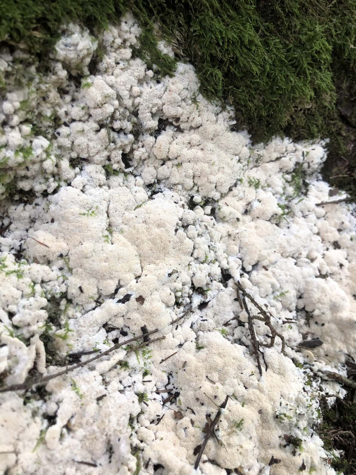 Die im Außenraum aufgestellten Objekte durchlaufen einen permanenten Transformationsprozess - bearbeitete Baumstämme, die mit einer lokalen Pilzart besiedelt sind. In der Folge bildet sich auf ihnen ein Habitat für verschiedenste Organismen, während das Holz darunter nach und nach zu Humus zerfällt. Alle beteiligten Akteure kommunizieren miteinander, sowohl nach innen wie nach außen. Das Myzel, das ähnlich unserem Nervensystem funktioniert, macht die Stämme zu lebendigen und kommunizierenden Skulpturen, die gleichzeitig unter den Einwirkungen von Wetter und anderen Umwelteinflüssen steht. Es sind Schwellenwesen, die materielle und Erfahrungsebenen miteinander verbinden.