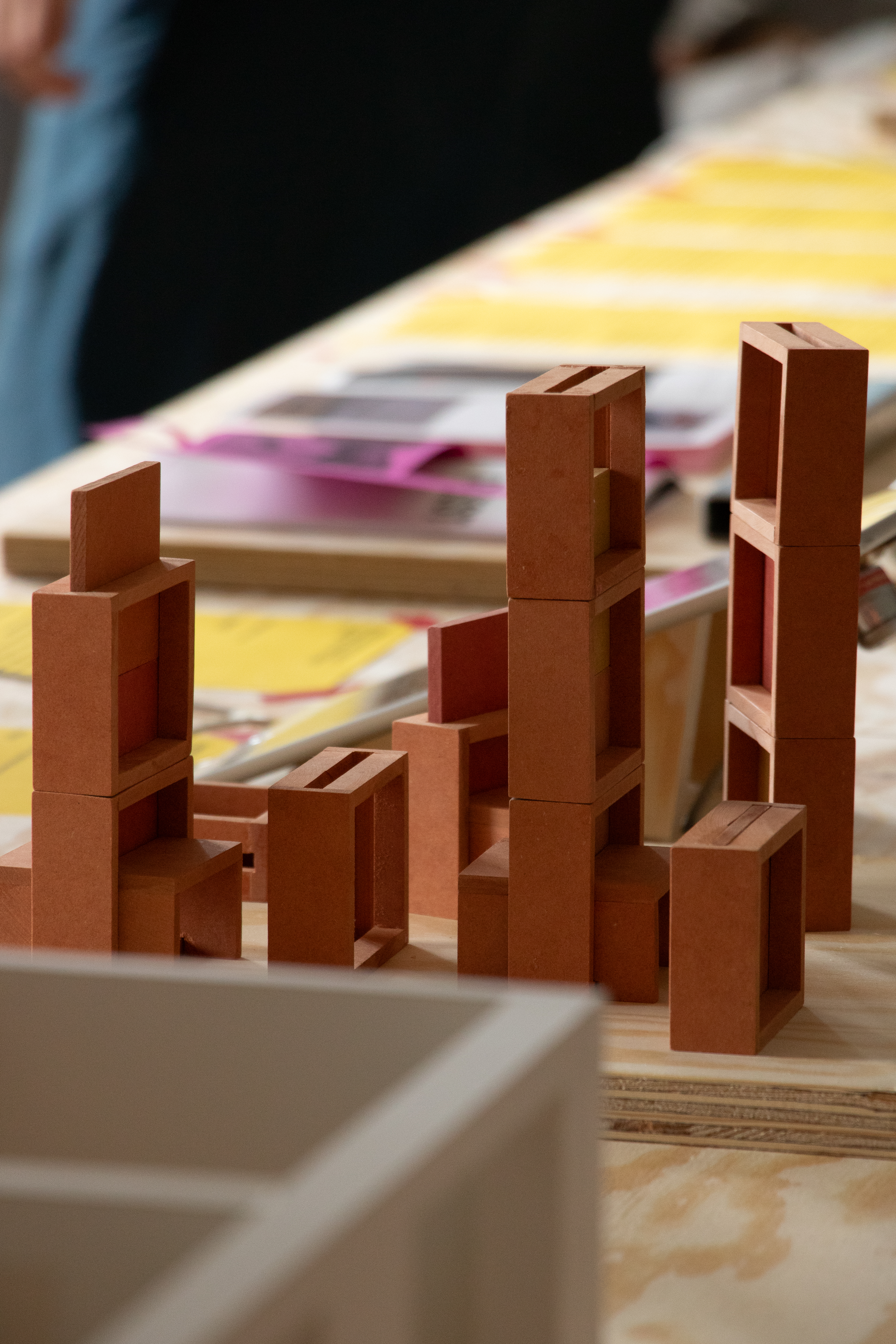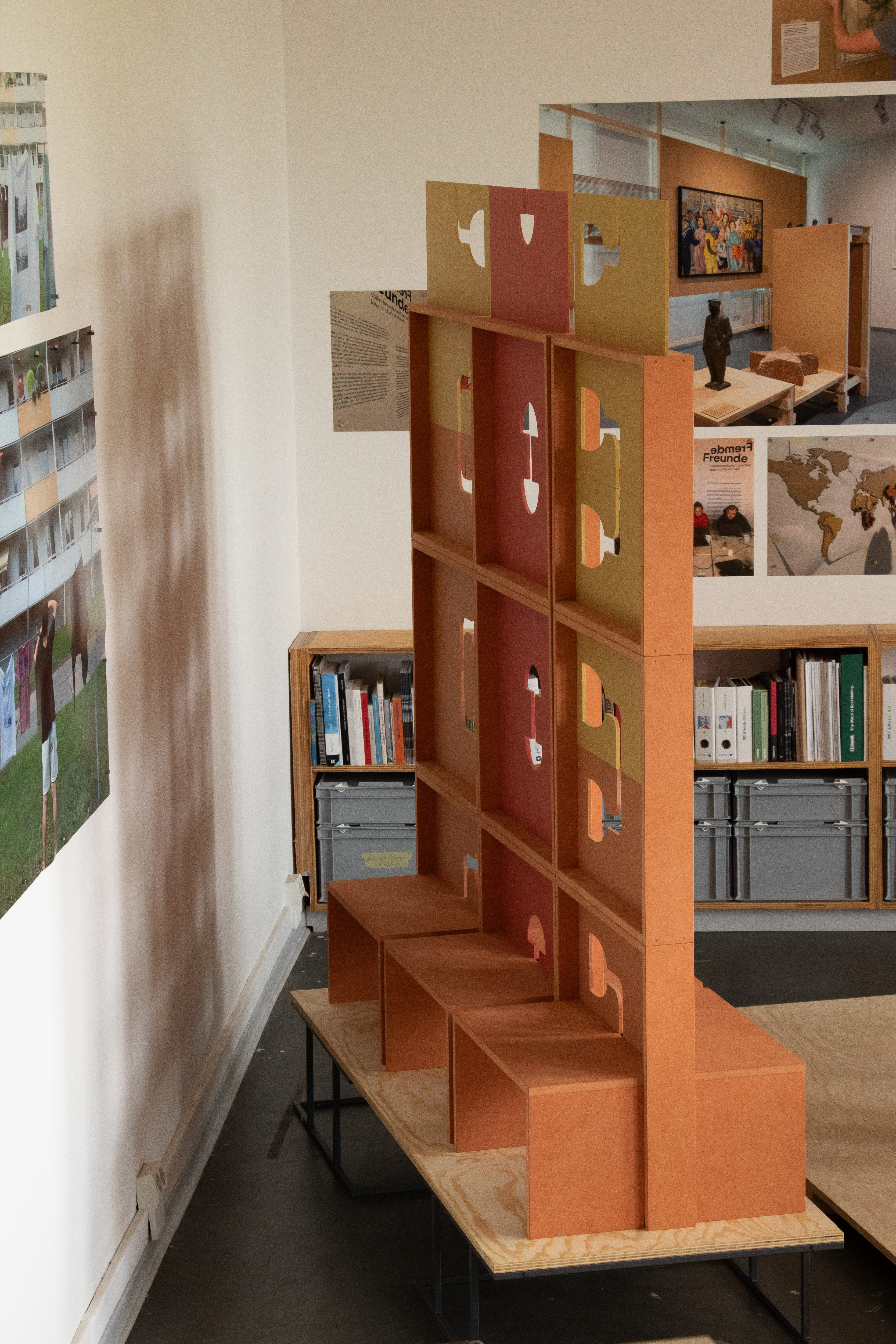 Die Grundrisse von Plattenbauwohnungen lassen sich variieren: Durch Entfernung nichttragender Wände und den Einsatz flexibler Raumteiler wie verSteck. verSteck ermöglicht es, Räume zu gliedern, ohne sie zu zerteilen. So lassen sich beispielsweise ein Wohn- und ein Arbeitsbereich in einem Raum unterbringen, der nun Platz bietet für Konzentration und Geselligkeit. Die durchbrochenen Paneele lassen Lichteinfall und Blickbeziehungen zu und laden durch Modularität und die Leichtigkeit des Umbaus ein, immer neue Varianten zusammenzustecken. Inspiriert von Elementen – wie den Formbetonsteinen – aus dem Stadtbild erzeugt verSteck eine Verbindung zwischen privatem Wohnraum und der Stadt und stärkt die Identifikation mit dem Wohnumfeld.