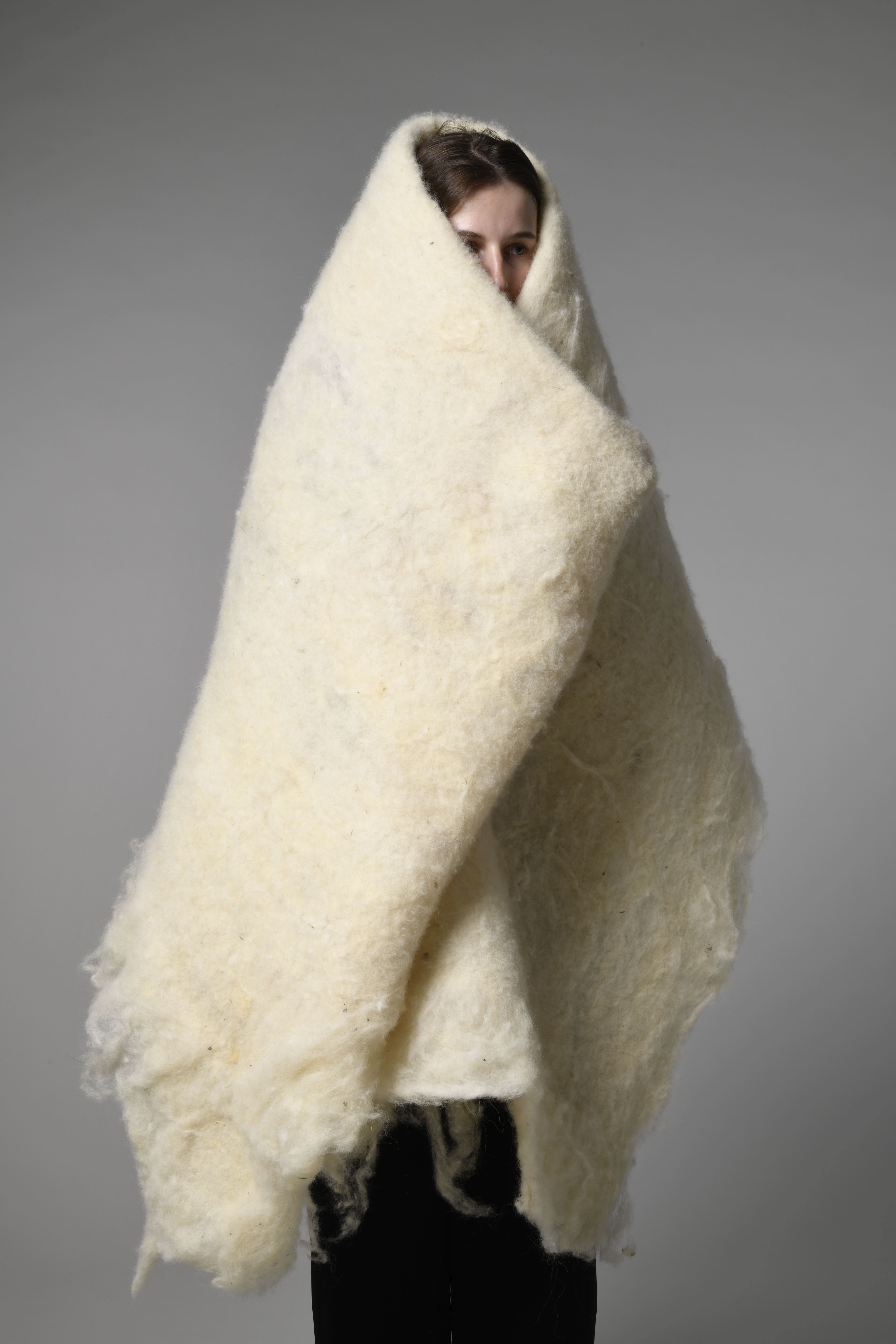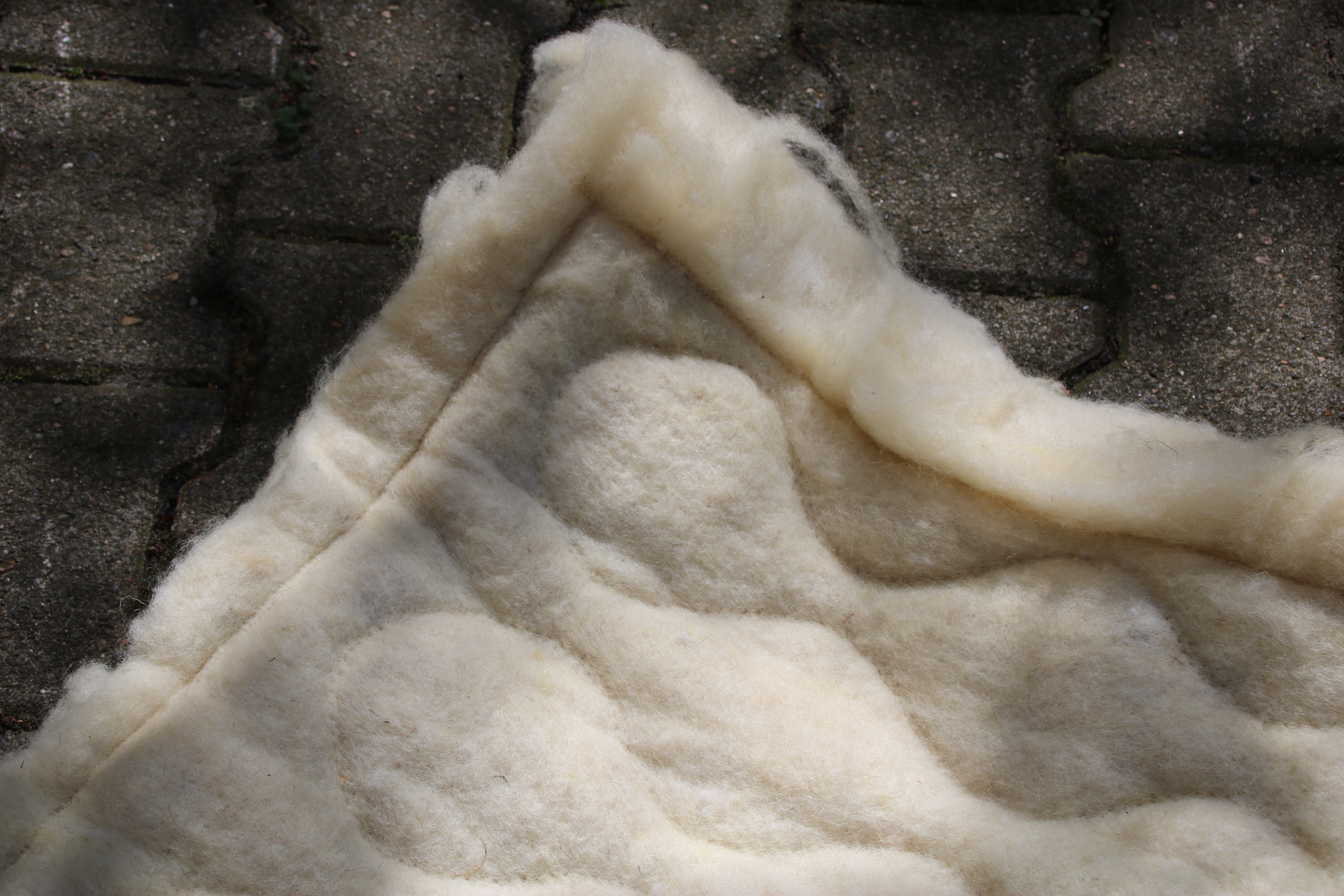 Wolle wärmt, isoliert, düngt, bindet Schadstoffe und absorbiert Schall. Dennoch werden in Brandenburg jährlich rund 290 Tonnen Schafwolle entsorgt. Gleichzeitig leben tausende Menschen in Berlin ohne festen Wohnsitz. Kann diese regionale Wolle obdachlosen Menschen Wärme und Schutz bieten? Unser Designprozess war iterativ und praxisorientiert. Mit der regionalen Wolle erforschten wir Filztechniken, per Hand und Roboter. In Filzworkshops, die wir bei der Bahnhofsmission organisierten, sprachen wir mit obdachlosen Menschen, um den emotionalen und praktischen Wert der Wolle besser zu verstehen. Proben und Feldforschung dienten uns als Grundlage, um größere Prototypen für Nutzertests zu erstellen. Entstanden ist eine tragbare Wollmatte, die auf beiden Seiten über integrierte Schnüre verfügt. Diese gewährleisten eine ganzjährige, multifunktionale Einsetzbarkeit zur Isolierung, für mehr Komfort und zur Unterstützung der Nutzer. Zum anderen haben wir wertvolles Wissen über Wolle gesammelt und dokumentiert. Mit WARM setzen wir den Fokus auf positive Effekte für Mensch und Umwelt und arbeiten dabei kollaborativ zusammen.