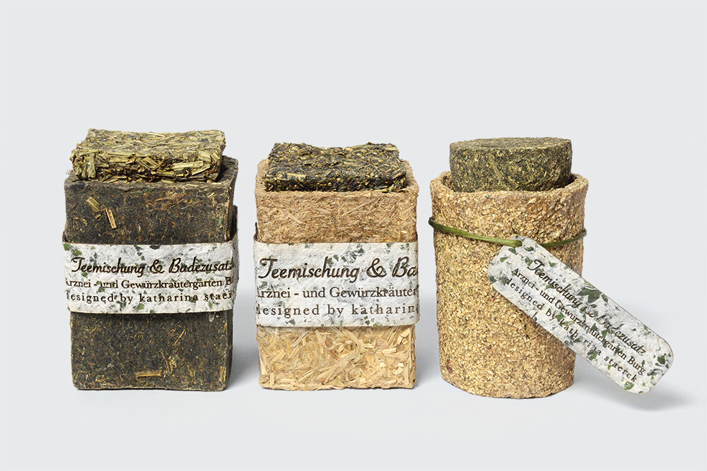 Das Projekt konzentrierte sich schließlich auf die Entwicklung einer ökologischen Alternative zu den bisherigen Teeverpackungen. Sie sollte unmittelbar auf den Rohstoffen des Gartens bzw. der Natur basieren, mit dem Inhalt harmonieren, nach Gebrauch sinnvoll und umweltverträglich weiterverwendet werden können und am Ende auch keinen Müll erzeugen. Den Schlüssel hierzu bot der Biokomposit-Workshop mit der De- signerin Mareike Gast, bei dem u.a. deutlich wurde, welche enormen Stabilitäten mit natürlichen Materialien erzielt werden können. Aus einfachen, leicht erhältlichen und umweltfreundlichen Bestandteilen lassen sich ungewöhnliche und funktionale Objekte herstellen, die nicht nur in vielerlei Hinsicht nützlich sind, sondern auch noch reizvoll aussehen.